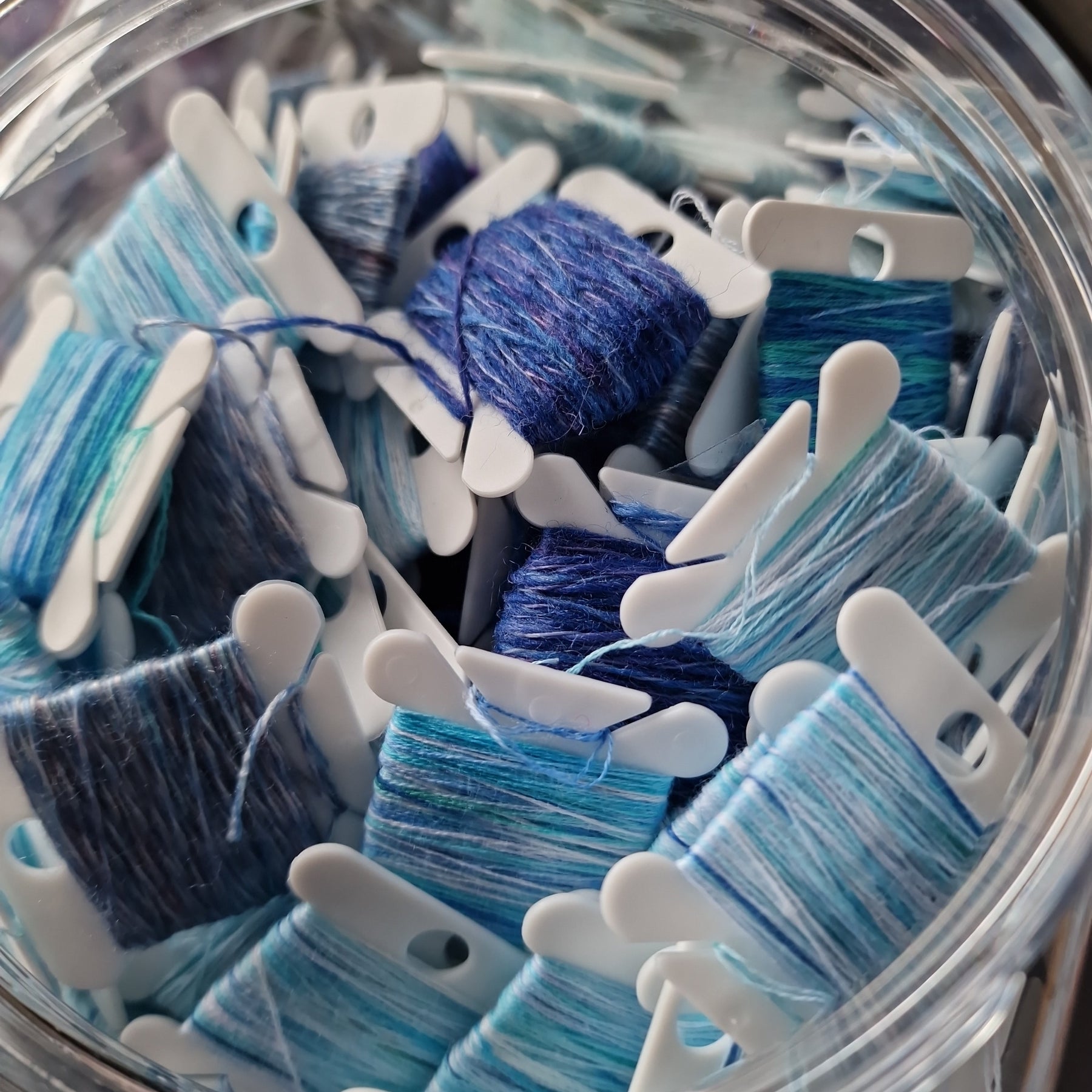 Each thread is dyed in my Norfolk studio using a slow, considered process that allows the colour to move naturally through the fibres. By working with one ball or cone at a time and introducing more than one colour, every batch develops its own character, with subtle blends and gentle variations that emerge as you stitch.